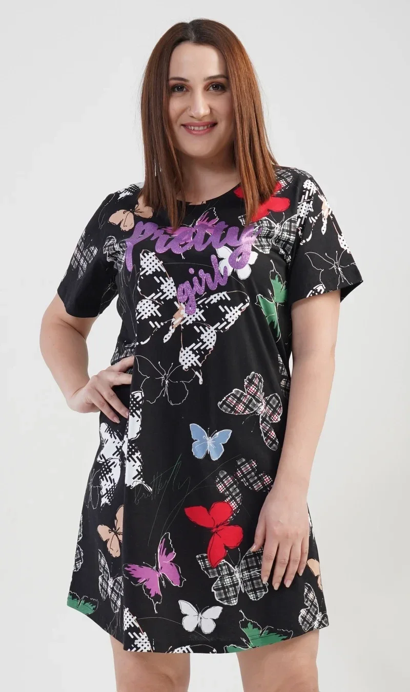 Dámská bavlněná noční košile s krátkým rukávem Pretty girl. Dámská košile je zdobena motýlky a nápisem 'Pretty girl'. Použitý bavlněný materiál je příjemný a poddajný na dotek.