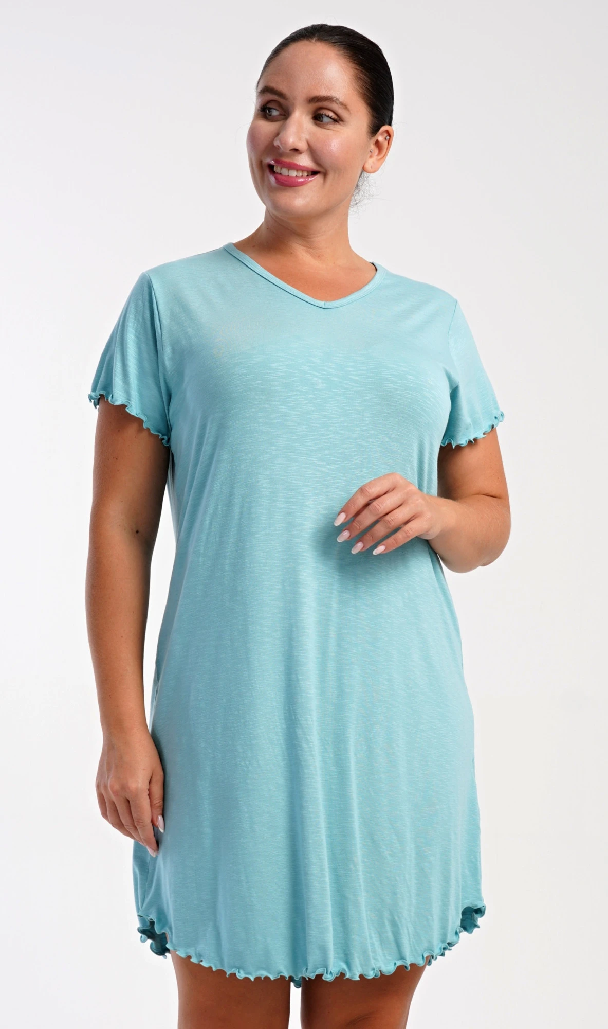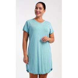 Dámská bavlněná noční košile s krátkým rukávem Sabrina. Košile má příjemnou délkou nad kolena a výstřih do V, je ozdobena žlábkováním na rukávech a spodním lemu. Použitý materiál s podílem bavlny 95% je příjemný a poddajný na dotek.
