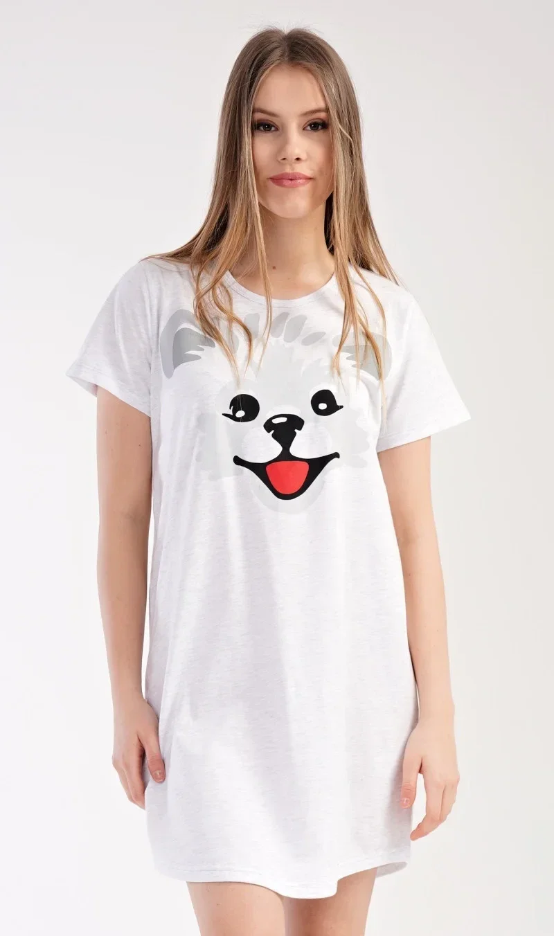 Dámská noční košile s krátkým rukávem Štěně. Dámská noční košile je jednobarevná, na hrudi je obrázek veselého štěněte. Použitý materiál s obsahem bavlny 70% je příjemný a poddajný na dotek.