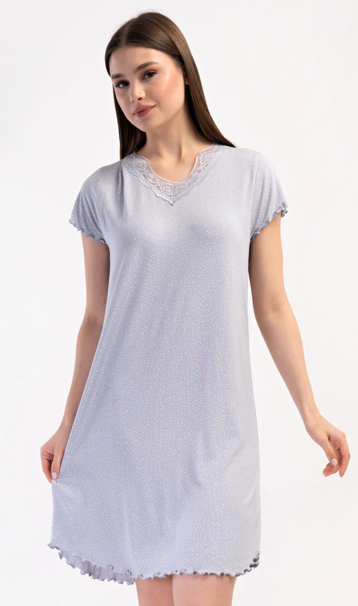 Dámská noční košile s krátkým rukávem Vločka. Noční košile s příjemnou délkou po kolena má žlábkování na rukávech a spodním lemu, výstřih je ozdoben krajkou. Na látce košile jsou natištěny drobné puntíky. Použitý viskózový materiál s příměsí lycry je příjemný a poddajný na dotek.