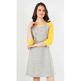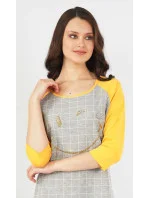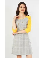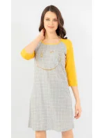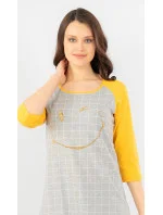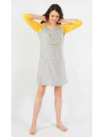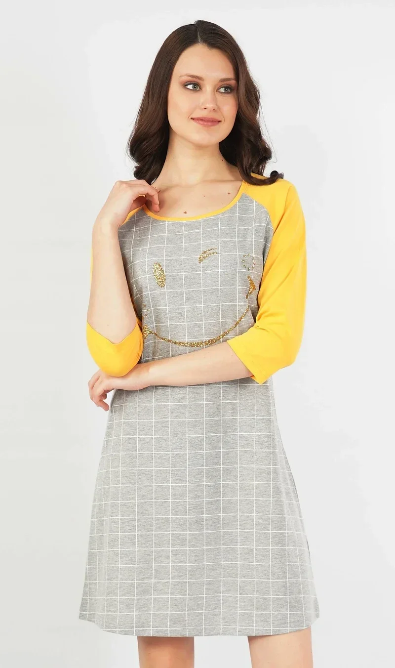Dámská noční košile s tříčtvrtečním rukávem Úsměv. Zajímavá a výrazná noční košile má pohledově barevně odlišené rukávy. Na hrudi je zlatý obrázek rozesmátého smajlíka na kostkovaném podkladu. Použitý materiál je jemný a poddajný na dotek. Košile je vhodná i na denní nošení.