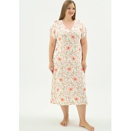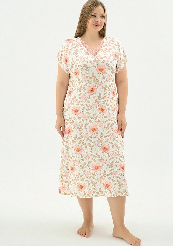 Dámská noční košile s jemným květinovým designem je ideální volbou pro pohodlný spánek i chvíle odpočinku. Volnější střih se spadlými krátkými rukávy zajišťuje maximální komfort a příjemnou volnost pohybu během celé noci. Výstřih do V je ozdobený elegantní krajkou, která dodává košili něžný a romantický vzhled. Délka do poloviny lýtek působí vzdušně a zároveň poskytuje dostatek pohodlí. Díky lehkému a příjemnému materiálu se košile skvěle nosí a je ideální pro každodenní použití i klidné večery doma.