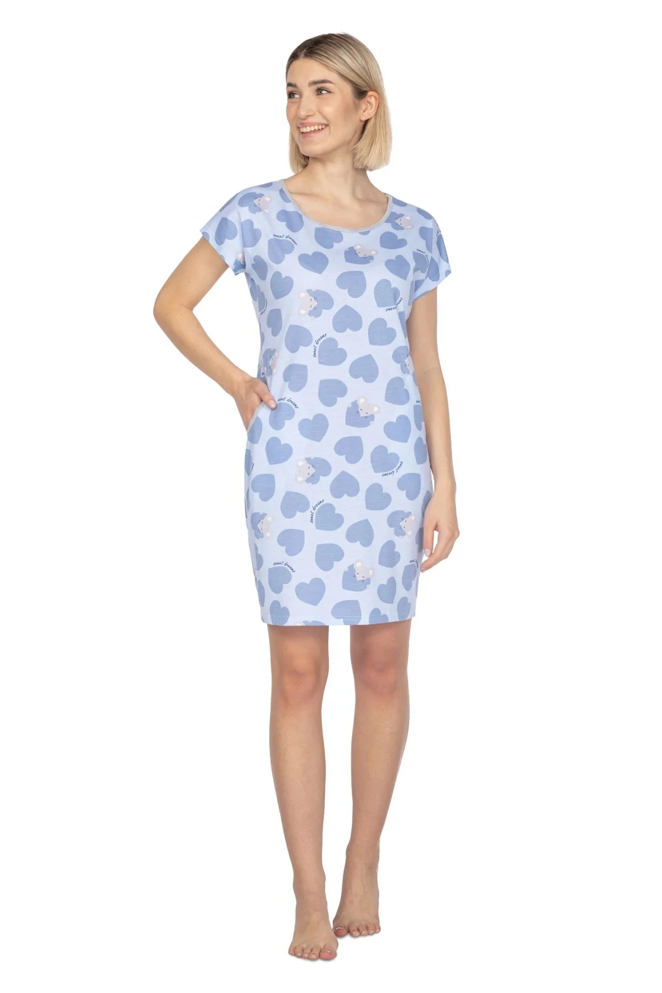 Dámská noční košilka 122 light blue REGINA - světle modrá barva - z vysoce jakostní bavlny - krátké rukávy - se vzorem - s kapsami