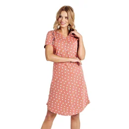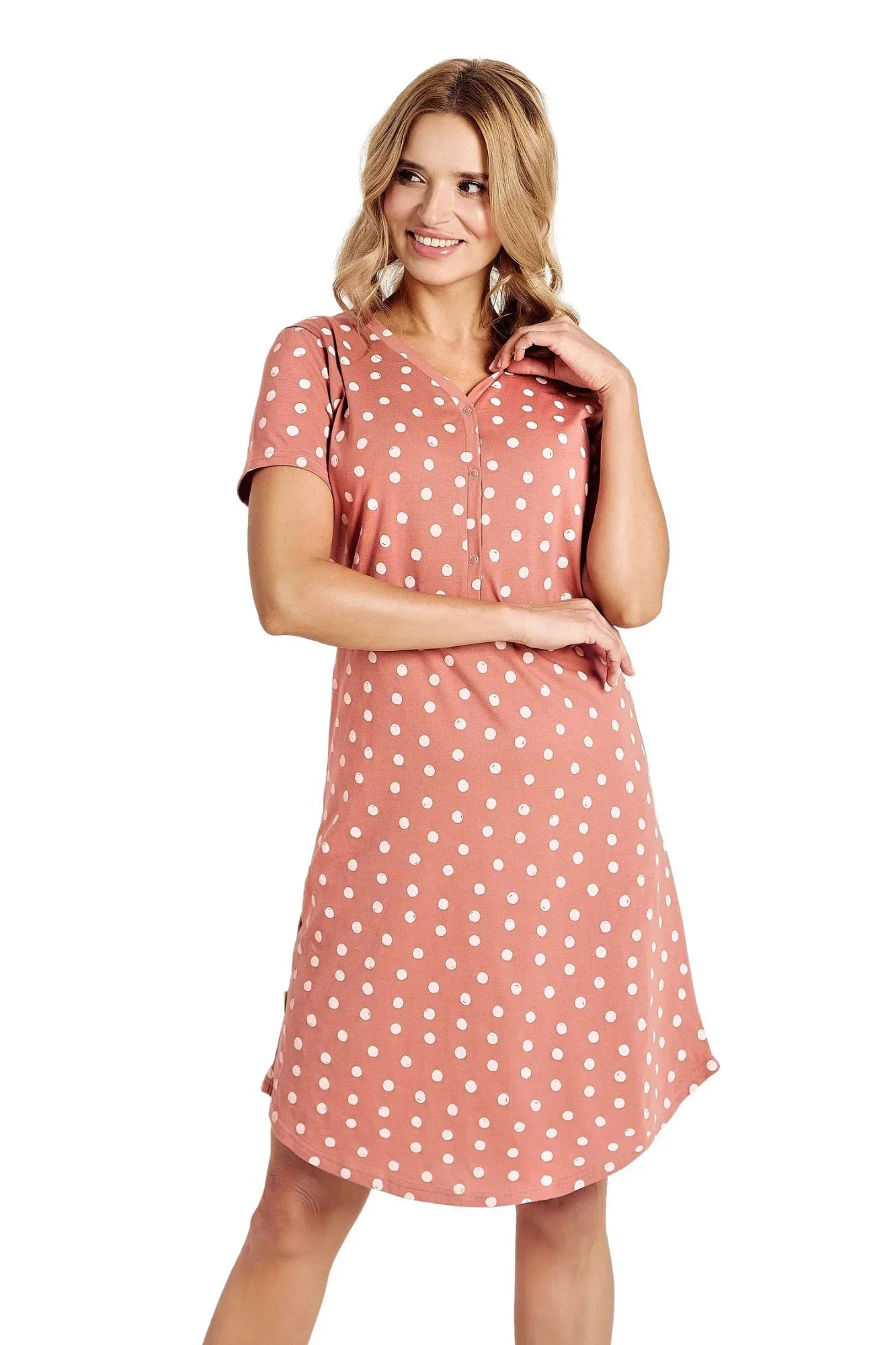Dámská noční košilka 3129 Ivy TARO - cihlová barva - z velmi kvalitní bavlny - s krátkými rukávy - s potiskem - zapínání na knoflíky - délka ke kolenům