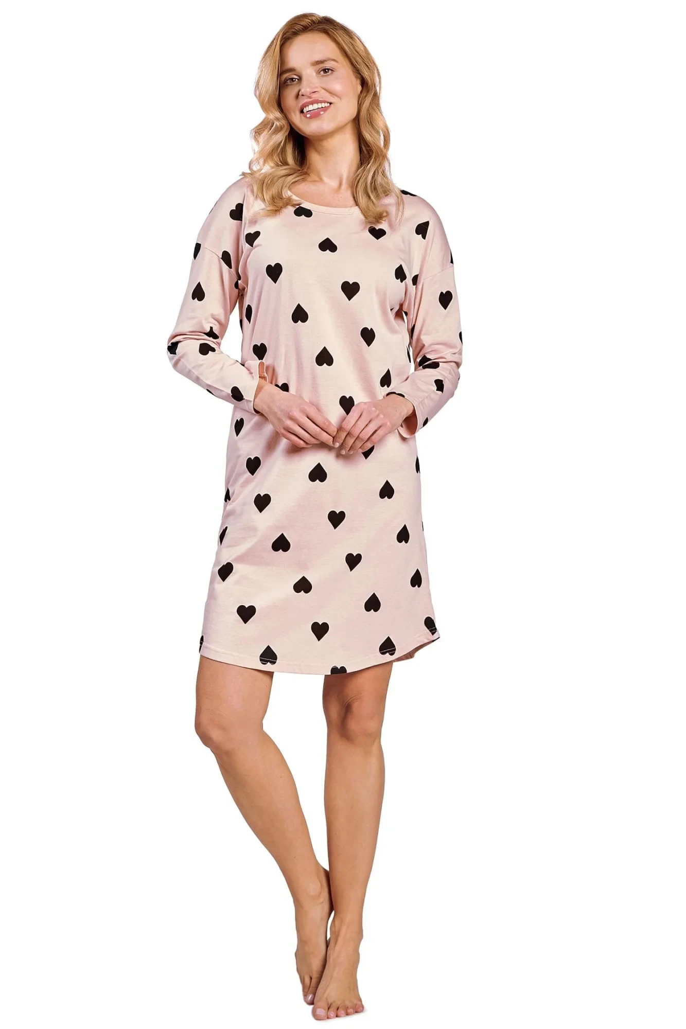 Dámská noční košilka 3207 Hannach TARO - růžová barva - z vysoce jakostní bavlny - se vzorem černých srdíček - dlouhé rukávy - lemy rukávů a spodní části zakončené jemným řasením