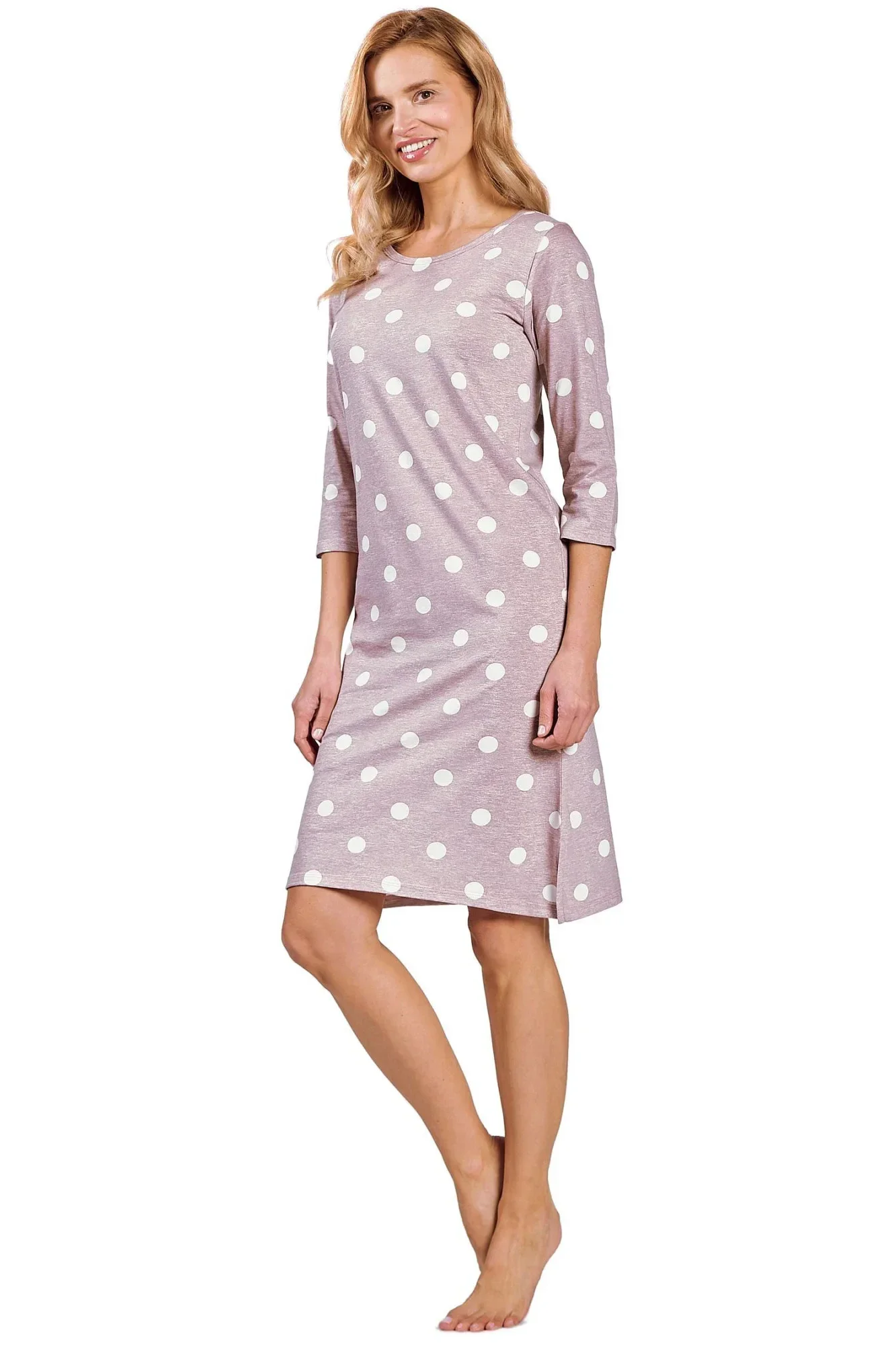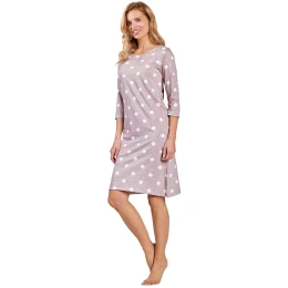Dámská noční košilka 3213 Dolly TARO - béžová barva - z vysoce jakostní bavlny - se vzorem bílých puntíků - tříčtvrteční rukávy - lemy rukávů a spodní části zakončené jemným řasením