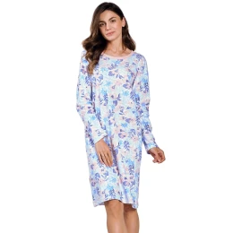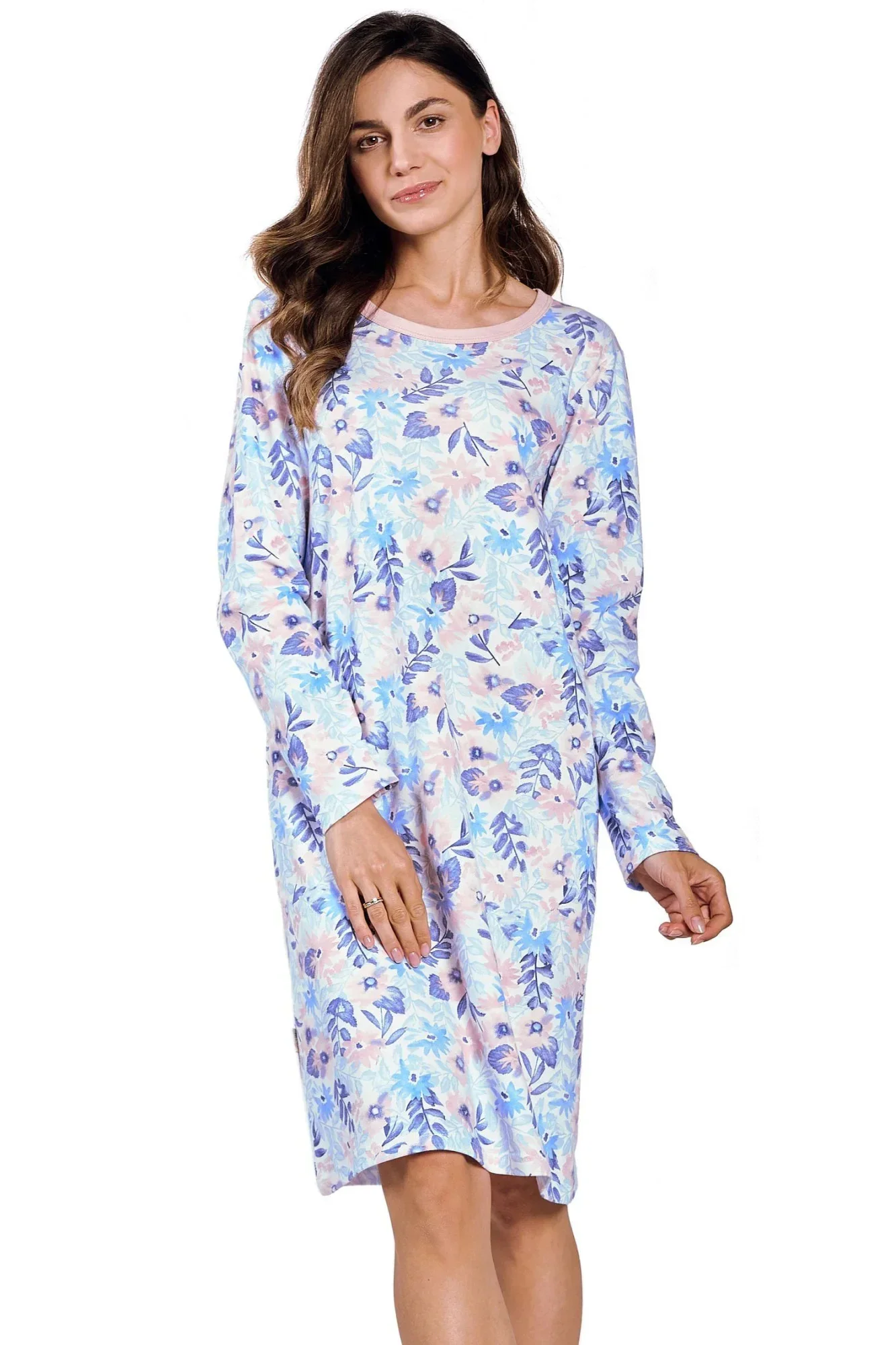 Dámská noční košilka 3238 Ginny TARO - světle modrá barva - z vysoce jakostní bavlny interlook - se vzorem květů - dlouhé rukávy