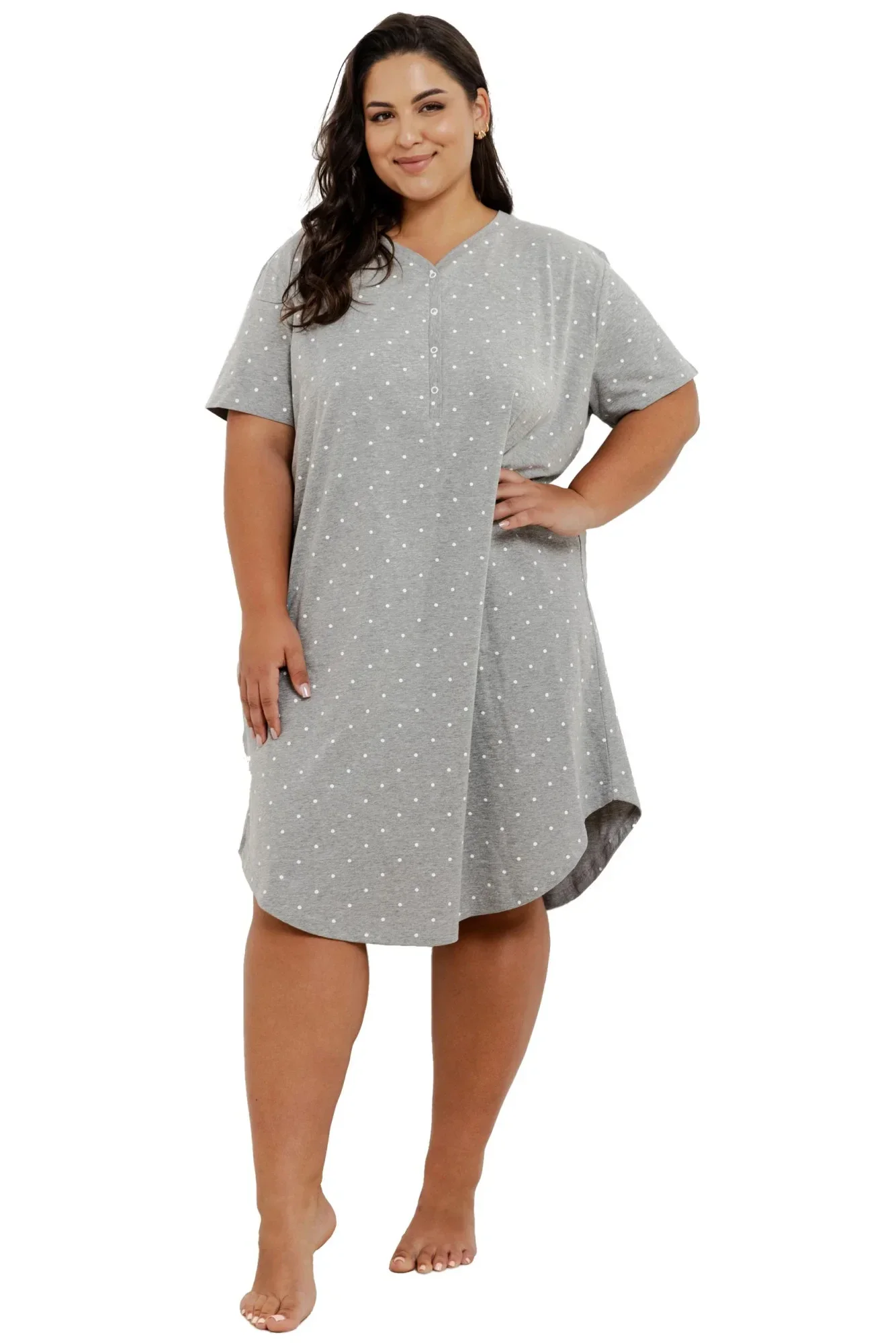 Dámská noční košilka 3367 Meg grey TARO - šedá barva - z vysoce jakostní bavlny - zdobená černými puntíky - výstřih do V se zapínáním na patentky - krátké rukávy
