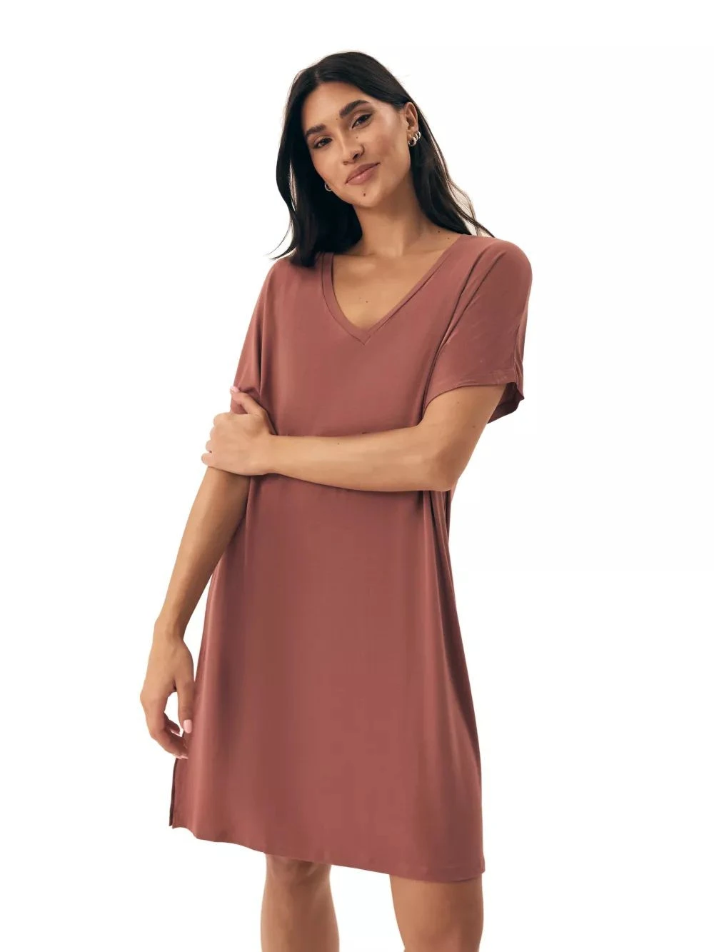 Dámská noční košilka 43041 Noves brown HENDERSON - hnědá barva - z vysoce jakostní viskózy - krátké rukávy - výstřih ve tvaru V - volný střih