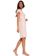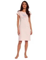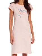 Dámská košile s krátkým rukávem, ušitá z měkké jednotné bavlny. Barevný potisk na úrovni hrudníku. Kulatý výstřih, délka košile před kolena. Baleno v krabici.