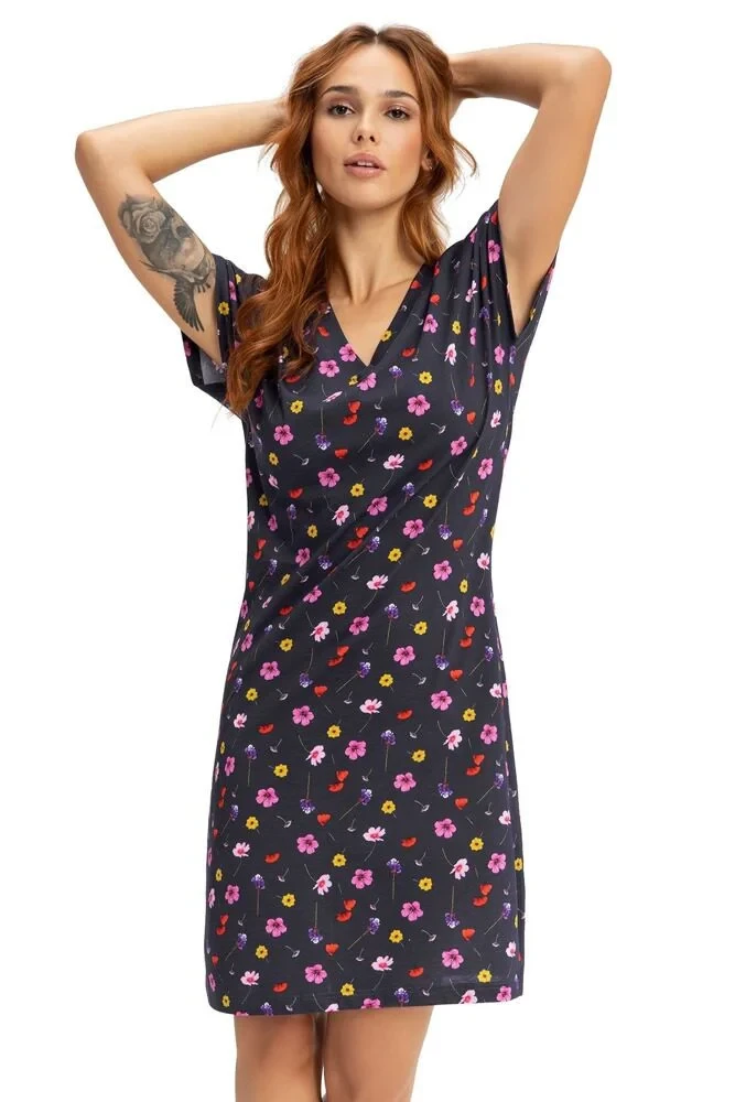 Dámská noční košilka Ismena blue Donna - tmavě modrá barva - z vysoce jakostní viskózy - krátké krajkové rukávy - pod prsy je nařasená - krajková záda