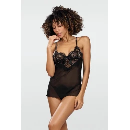 Košilka má přiléhavý střih, který svůdně zvýrazňuje tvary ženské postavy. Ramínka jsou tenká a jejich délku je možné nastavit. Komplet doplňují černé kalhotky string (tanga).