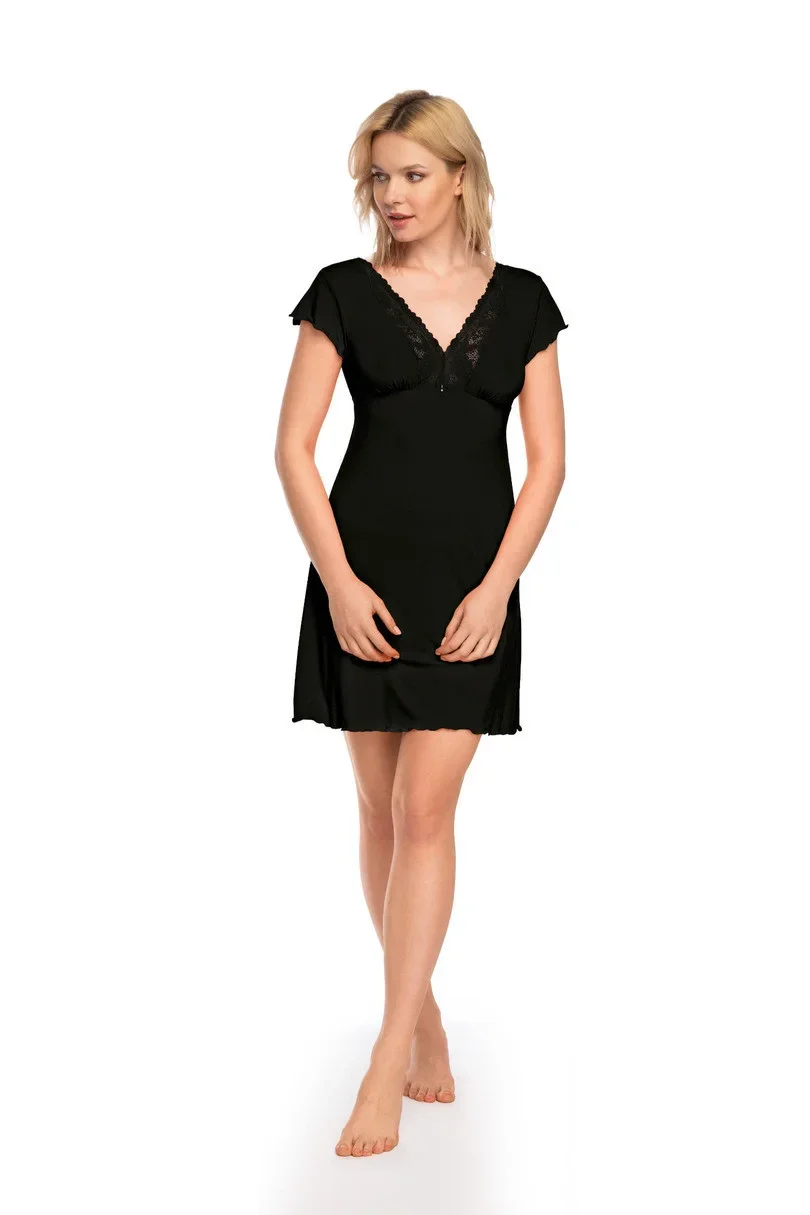 Výstřih ve tvaru písmene "V" je ozdobený krajkou.