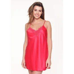 Dámská noční košilka značky Lingadore. Košilka je ušitá ze saténové látky, v přední části na hrudníku je našitá pružná krajka. Košilka má tenká ramínka, která se vzadu překřižují, ramínka se dají délkově nastavit. Vzadu má košilka výstřih do "V". Košilka je kratší, je mírně rozšířená.