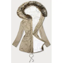 Béžová dámská zimní bunda typu parka s mechovitou kožešinovou podšívkou a s kapucí (7602BIG)