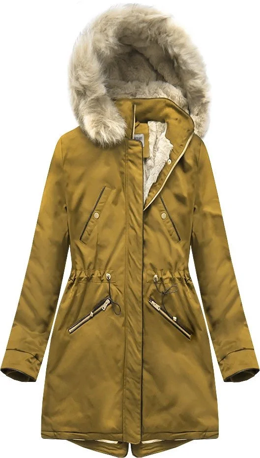 Žlutá dámská zimní bunda parka s mechovitou kožešinovou podšívkou (b2623)