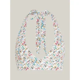 Tento trojúhelníkový top s hlubokým výstřihem, roztroušenými TH monogramy a páskem na zavazování je luxusní.