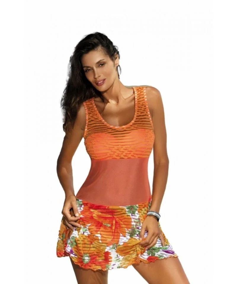 Atraktivní, elastické letní šatičky. Tunika z jemné, vzorované tkaniny. Vrchní část je lehce přiléhavá, spodní část je volnější. Dekolt je průsvitný, střed je ze síťoviny. Sukýnka je ozdobena květinami, je také částečně průsvitná. Tuniku využijete na pláži i při procházce městem. Ochrání Vás před přímým sluncem, doplní plavky zajímavým šmrncem.