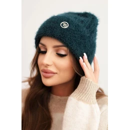 Dámská pletená čepice z viskózy huňatá s ozdobným kovovým knoflíkem mořská