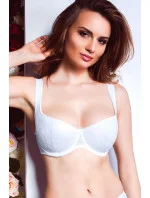 Bílá vyztužená balkonová podprsenka se smyslnými košíčky z květinové krajky. Ideální pod hluboký výstřih šatů nebo halenky. Mezi šálky je jemná mašlička. Model má vpředu široká a vzadu úzká nastavitelná ramínka, která dokonale podrží i velké a těžké poprsí. Tento střih je ideální pro hluboký výstřih šatů nebo halenky.