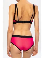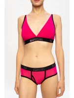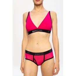 Růžová podprsenka značky Diesel. Tento kousek je zakončen nastavitelnými popruhy a elastickým páskem zdobeným logem vykládaným stříbrnou a lurexovou přízí.