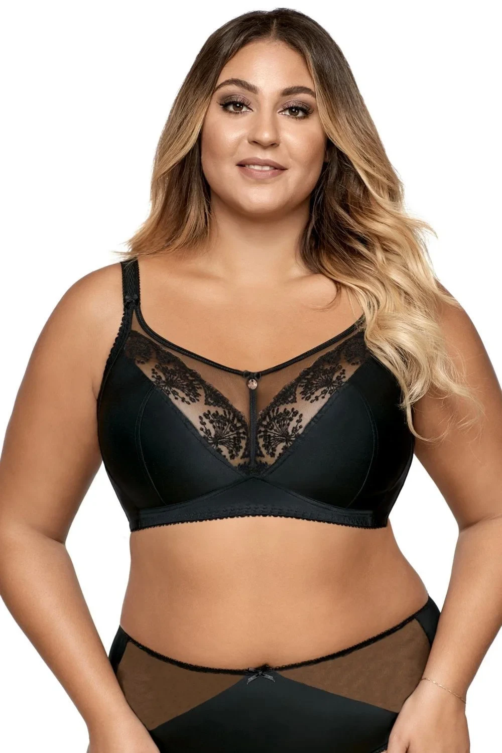 Dámská podprsenka 1691/1 Libi black AVA - černá barva - typ soft - měkké hladké košíčky - podšité látkou - horní část z průsvitné síťoviny a krajky - široká ramínka - zapínání na dva nebo tři háčky s třístupňovým zapínáním - ideální pro ženy s větším a plnějším poprsím
