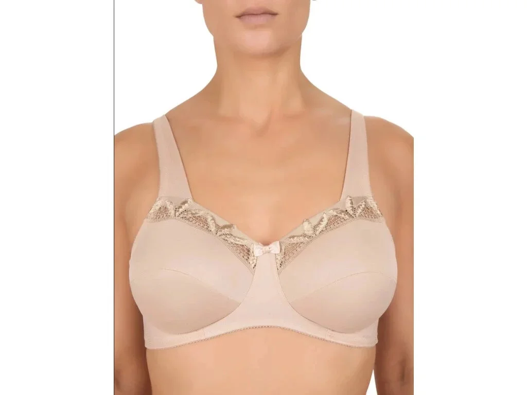 Dámská podprsenka bez kostice je díky větším velikostem košíčků a zesíleným ramínkám vhodná i pro ženy s plnějším poprsím. Podprsenka je vyrobena z velice příjemného materiálu a nad košíčky je zdobena speciálním vyšíváním. Barva černá a naturál má delší dodací termín.