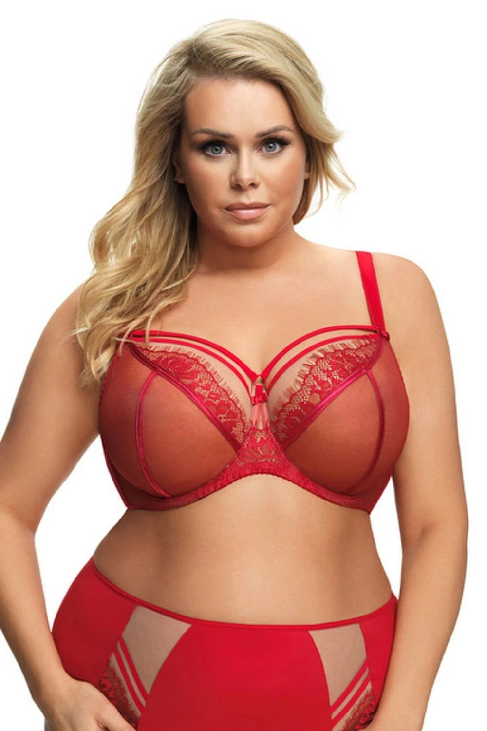 Dámská podprsenka 496 Paradise red GORSENIA - červená barva - z dvojité tylové látky - vrchní část košíčků tvoří béžový tyl a jemná krajka - model je olemovaný hladkou pružnou páskou - nad košíčky je ozdoba ve tvaru jemných pásků - ramínka je možné nastavit, ale nelze je odepnout