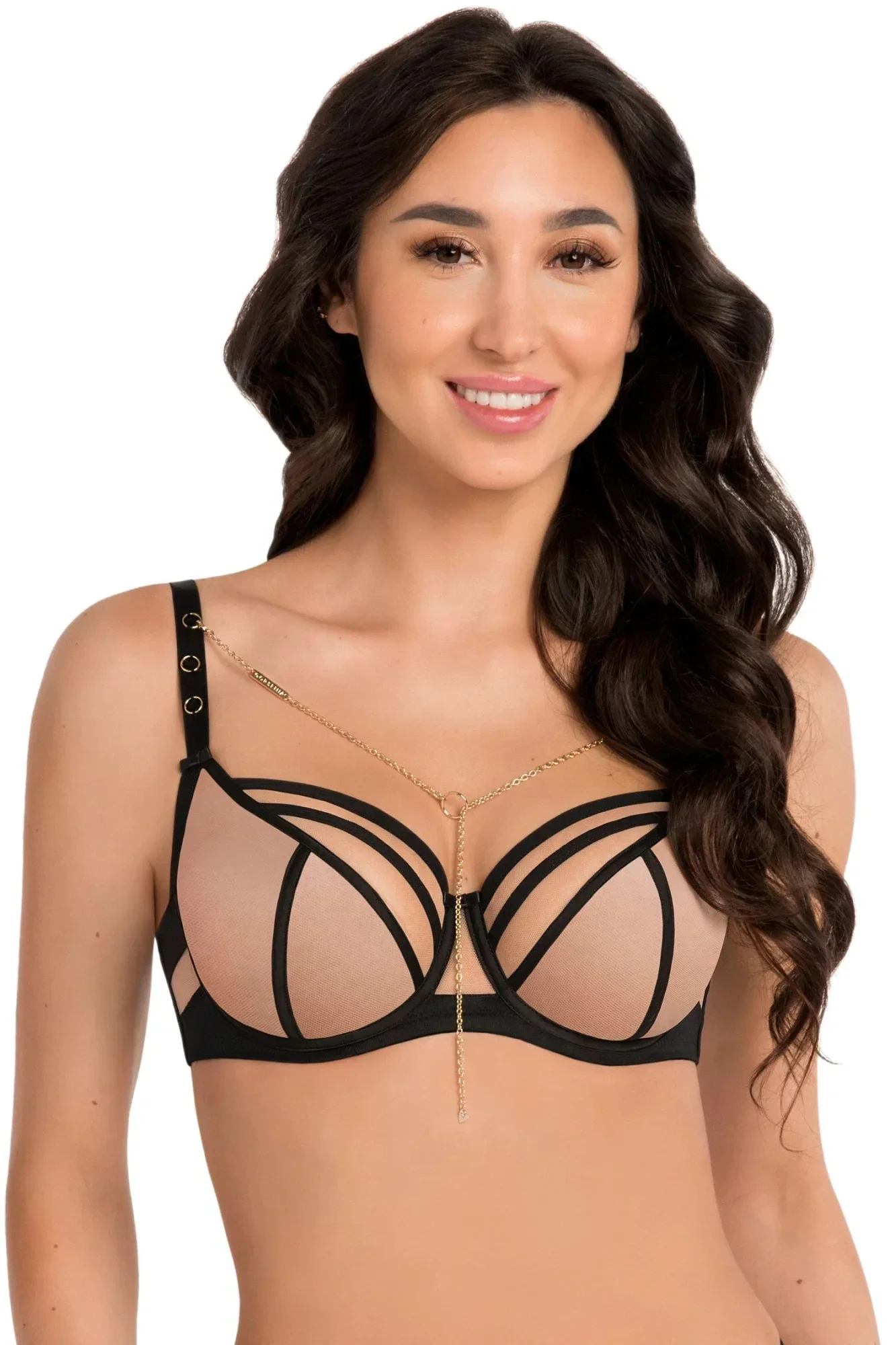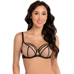 Dámská podprsenka 885 Tesora GORSENIA - béžová barva - měkká podprsenka s kosticemi - poskytuje efekt velmi silného zvednutí a stažení prosu dovnitř - krásná a tvarovaná prsa - třídílné košíčky z tylu se švy přikrytými saténovou páskou - odpínatelný ozdobný řetízek - krásně zvýrazněný výstřih - na zádech zakončená širokou a měkkou gumičkou - boční kostice zabraňují rolování materiálu - neodepínatelná a nastavitelná ramínka ve třech šířkách - zlaté kovové prvky - zapínání na dva nebo tři háčky s třístupňovou regulací obvodu