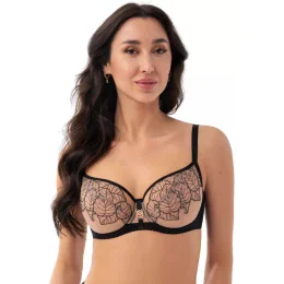 Dámská podprsenka 924 Palmira GORSENIA - černá barva - z průhledného tylu - zdobený černou výšivkou - třídílné košíčky - boční kostice - nastavitelná a neodepínatelná ramínka - zapínání na dvě nebo tři řady s třístupňovým zapínáním - kovové prvky v barvě růžového zlata - určená pro ženy se středně velkými, velkými a velmi velkými prsy