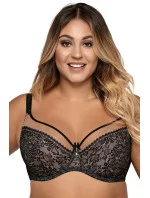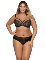 Górna część miski wykonana z tiulu wykończonego taśmą, dolna z koronki zdobionej haftem wykonanym złotą nitką. Miseczki głebsze, pełne, doskonale dopasują się do biustu.