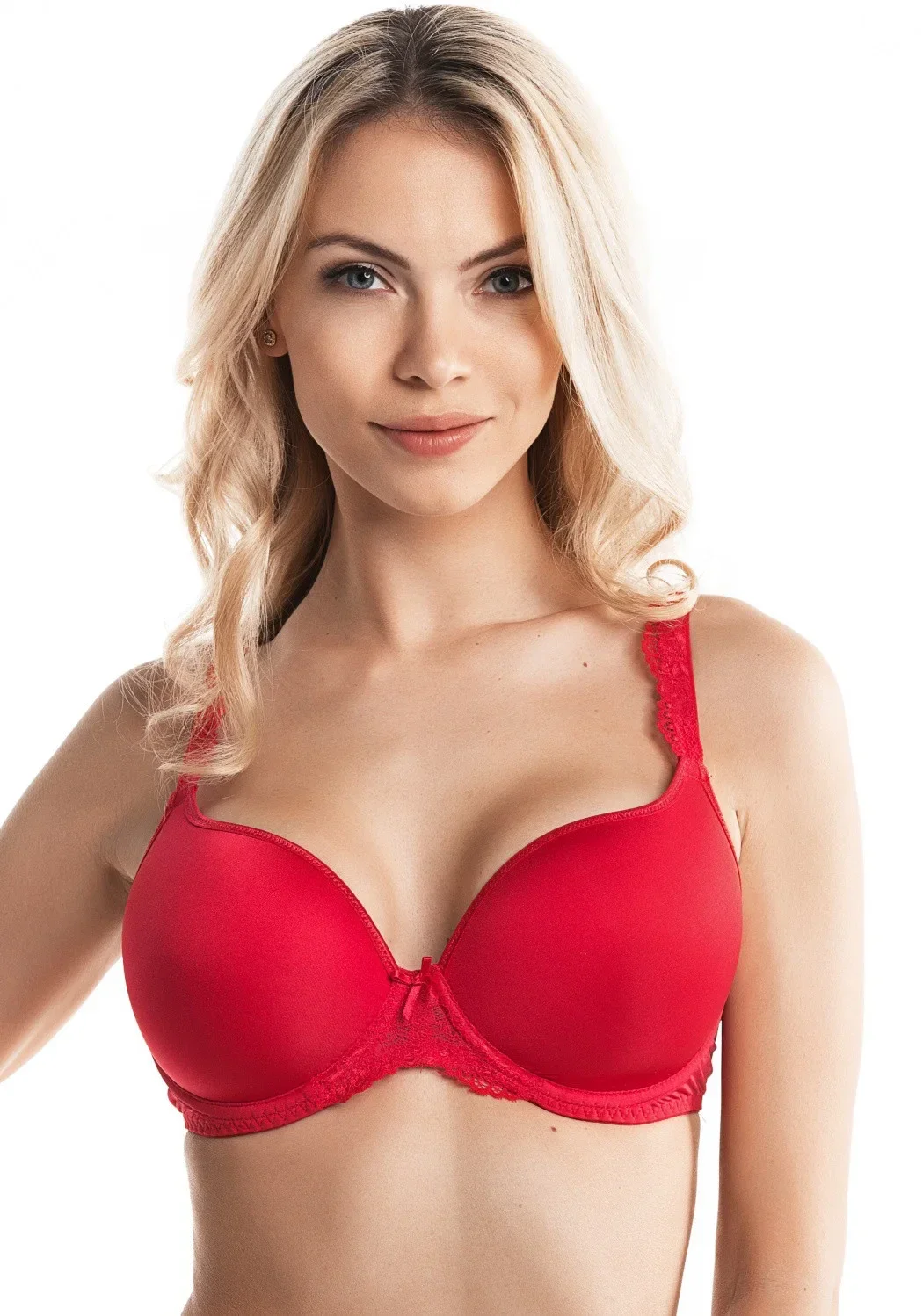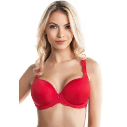 Dámská hladká podprsenka značky LingaDore v krásné červené barvě. Podprsenka má hladké košíčky s jemnou výztuží. Ve středu dekoltu je aplikována jemná krajka v kombinaci se saténovou mašličkou. Ramínka podprsenky jsou zdobena krajkou. Obvod podprsenky je hladký a má zapínání na dva háčky a tři pozice.