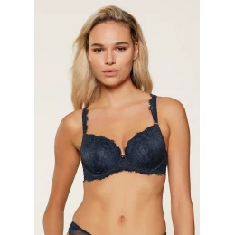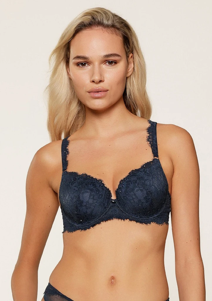 Zářivě modrá elegance! Vyztužená podprsenka LingaDore v odstínu Midnight Blue spojuje smyslný design s perfektní oporou. Košíčky s kosticí jsou potažené jemnou krajkou s decentním třpytivým efektem, který podprsence dodává luxusní vzhled. Pevnější vyztužení krásně tvaruje dekolt, zatímco krajková ramínka působí něžně a ženským dojmem. Mezi košíčky zdobí model drobný šperk, který podtrhuje jeho elegantní charakter. Zadní část je z lehkého tylu se zapínáním na tři háčky a tři pozice, takže podprsenka perfektně padne a poskytne pohodlí po celý den. Ideální volba pro ženy, které chtějí spojit půvab, pohodlí a sebevědomí v jednom kousku.