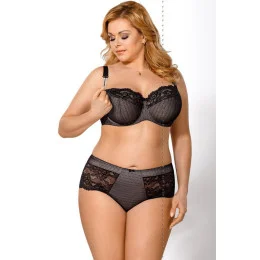 Měkká podprsenka s kosticemi pro kojící ženy.Košíčky modelu jsou vyrobené z černé puntíkované síťoviny a jsou podšité jemnou bavlnou. Horní linii zdobí efektní černá krajka. Ramínka mají zapínání typu Quick Clic. Díky tomu je možné odepnout a zapnout jednou rukou, což usnadňuje kojení dítěte.