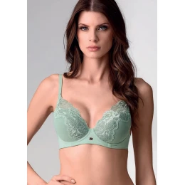 Elegantní dámská push up podprsenka z nové kolekce Saten. Podprsenka je jemně vyztužená do push up efektu, má kostice a hladký košíček má potahlý jemnou kraječkou. Mezi košíčky je ozdobná aplikace. Ramínka jsou pevně všitá, délkově nastavitelná. Obvod se zapíná na dva háčky a čtyři pozice.