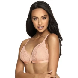 Luxusní dámská podprsenka od značky MAT. Podprsenka má úžasný jemný design díky zvolené něžné krajce. Má trojúhelníkový košíček podšitý tělovým tylem, ramínka zdobená malou saténovou mašlí a mezi košíčky je malý stříbný šperk s logem značky. Podprsenka se zapíná na jeden háček a má tři pozice.