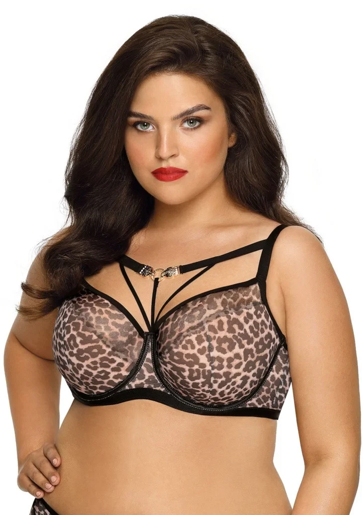 Dámská podprsenka značky Novika. Podprsenka je lehce vyztužená. Celá podprsenka je ušitá z příjemného a pružného tylu s leopardím vzorem. Obvod kostic je obšitý saténovým páskem, který je prošitý zlatou nití. Košíčky jsou podšité bavlněnou látkou proti průhlednosti. Nad košíčky v oblati hrudníku jsou našité pružné pásky na kterých je zlatá ozdoba s motivem leopardích hlav. Podprsenka má širší ramínka, která se dají délkově nastavit. Zapínání je na dva háčky a tři pozice.