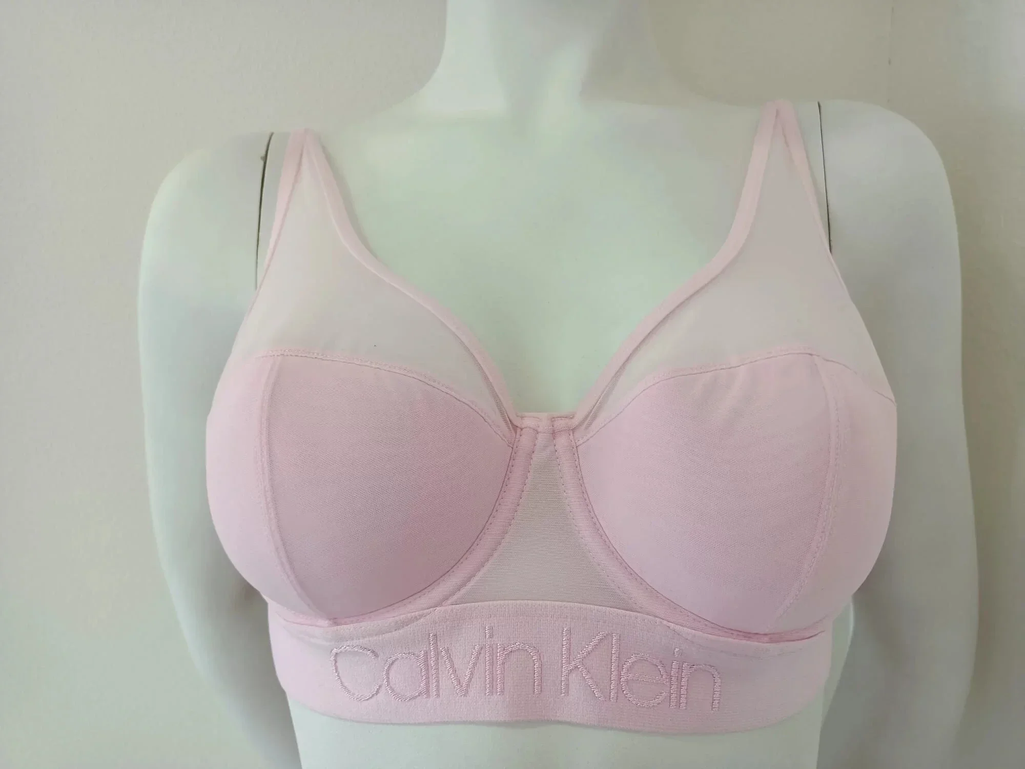 Dámská luxusní podprsenka Calvin Klein.Hladké, jemně vyztužené košíčky s kosticemi jsou potaženy velmi jemným, pružným tylem, který přechází až k ramenům. Ramínka jsou pevně všitá, lehce délkově nastavitelná. Široký obvod je z průsvitného, dvojitě šitého tylu v přední části, který je ukončen ve spodním obvodu pružnou gumou s vyšitým logem značky Calvin Klein v přední části. Zadní zapínání je na dva háčky a tři pozice. Tato podprsenka je dokonalým luxusním a zároveň lehce sportovním kouskem.