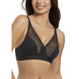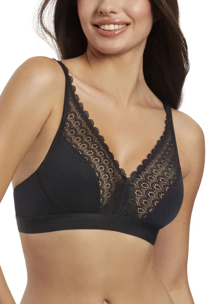 Dámská braletka od španělské značky Selene. Podprsenka má jemně strukturované nevyztužené košíčky bez kostic, které mají na hrudníku dekorovanou kraječku sahající až k ramenům. Pevně všitá ramínka jsou lehce délkově nastavitelná. Spodní část podprsenky tvoří jemná pružná guma. Zadní část ramínek je zdobena krajkou, která sahá ke spodní části podprsenky. Zapínání je na dva háčky a čtyři řady.