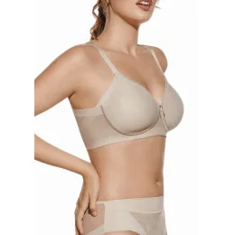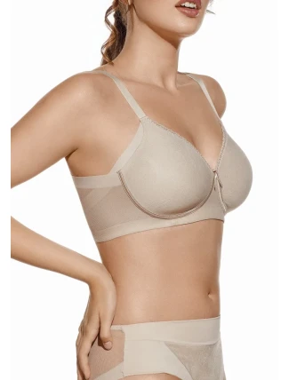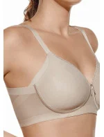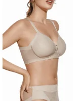 Dámská podprsenka od španělské značky Selene je vhodná pro běžné nošení i pod hladké oblečení. Podprsenka má vyšší střed a vyztužené košíčky bez kostic, které jsou hladké s jemnou strukturou látky. Spodní lem košíčků je zesílen. Z vnější strany jsou lemovány tenkou přiléhavou krajkou. Mezi košíčky je ozdobná mašlička. Ramínka jsou pevně všitá, délkově nastavitelná, hladká. Pružný obvod je vyšší, tvořený dvojitým tylem s širší gumou v okrajích, přeložen do kříže pro maximální podporu. Podprsenka má zapínání v zadní části na tři háčky a čtyři pozice, zapínání je vyměkčeno.