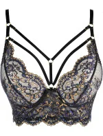 Měkký polokorzet z krásné třpytivé krajky zvýrazní a pozvedne vaše prsa v klasickém stylu, aniž by zakryl jejich přirozenou krásu. Polokorzet je vhodný pro každodenní vycházky i neobvyklé příležitosti s tmavým oblečením. Má zlaté obruče na spojených řemíncích, které jsou neodnímatelné, ale nastavitelné. Zadní díl tohoto modelu je tylový, ale širší a zapíná se na pětiřadový háček. Ve střední části poprsí je mezi košíčky systém pásků spojených kroužky ve zlaté barvě.