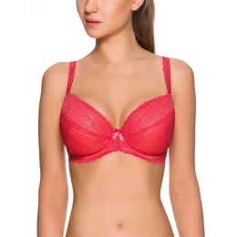 Push up podprsenka v korálové barvě s jemně vyzdobenými ramínky. Ramínka jsou regulovatelné, avšak ne odnímatelné. Ideální pro jarní a letní dny. Košíčky jsou pokryjte jemnou krajkou. Uprostřed podprsenky se nachází mašlička. Zadní část podprsenky je průhledná, tvořená z korálové krajky.