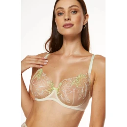 Béžová podprsenka se zajímavou výšivkou. Jemná výšivka s barevným květinovým vzorem. Měkké košíčky, částečně průhledné. Svislé boční velrybí kostice stabilizují obvod podprsenky. Zadní část podprsenky je vyrobená z tylu. Uprostřed ozdobná zelená mašlička. Podprsenka navržena a ušita v Polsku.
