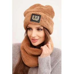 Dámská polarová souprava čepice a nákrčník s ozdobnou nášivkou camelový