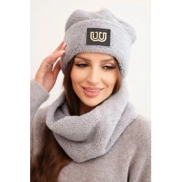 Dámská polarová souprava čepice a nákrčník s ozdobnou nášivkou šedý