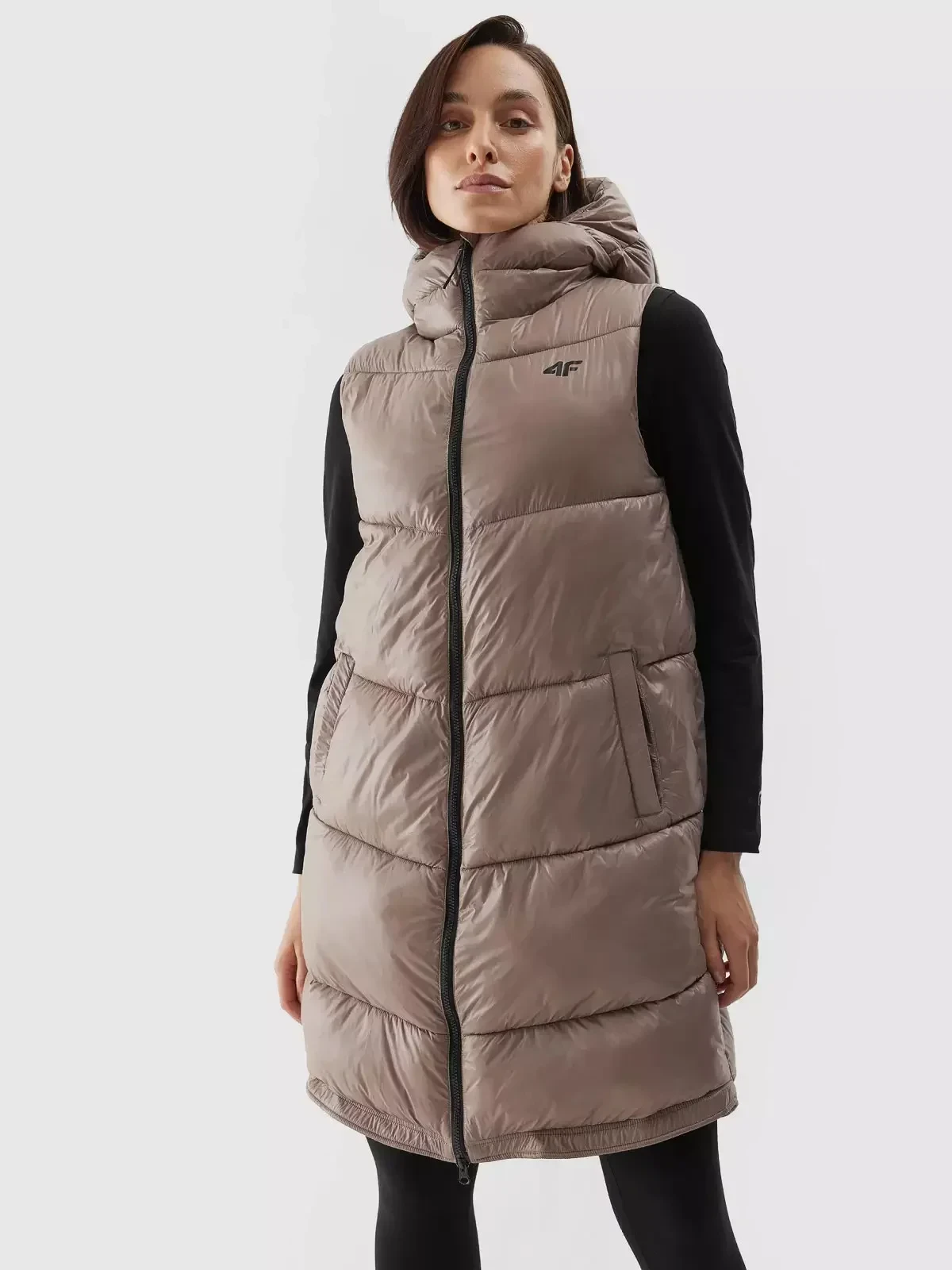 Dámská zimní prošívaná vesta 4F v delším střihu. Je vyplněna lehkým syntetickým peřím, které podpoří váš tepelný komfort při každodenních aktivitách. Péřová vesta má také pohodlnou kapuci s vysokým stojáčkem, která vás ochrání před větrem a kapsy, do kterých si můžete uložit drobnosti.