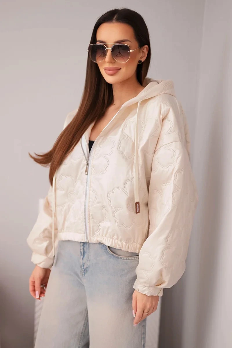 Dámská prošívaná bunda s kapucí a ozdobným květinovým ražením béžová