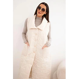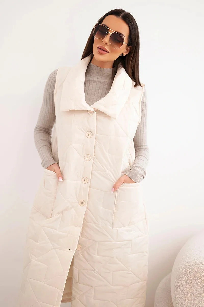 Dámská prošívaná dlouhá vesta s kapsami a stojáčkem světle béžová