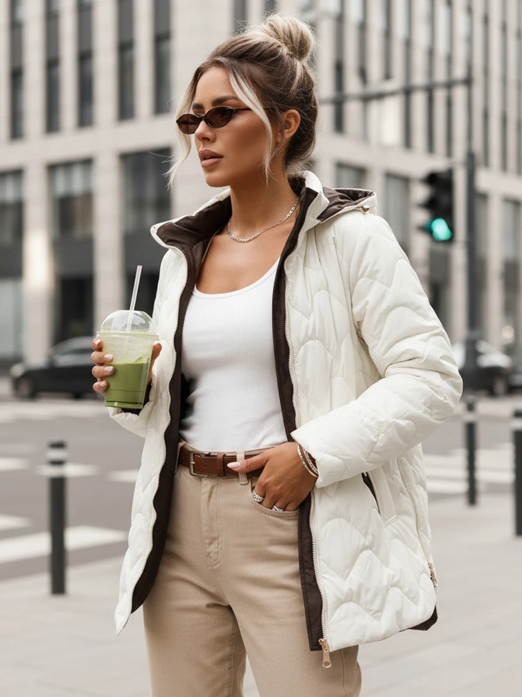 Bunda je ideální pro každodenní nošení, do práce i na výlety, kdy může být počasí nepředvídatelné. Vypadá dobře s džínami, látkovými kalhotami nebo legínami a boční zipy usnadňují kombinování s různými vrstvami pod ní. Odnímatelná kapuce umožňuje měnit styl v závislosti na příležitosti.