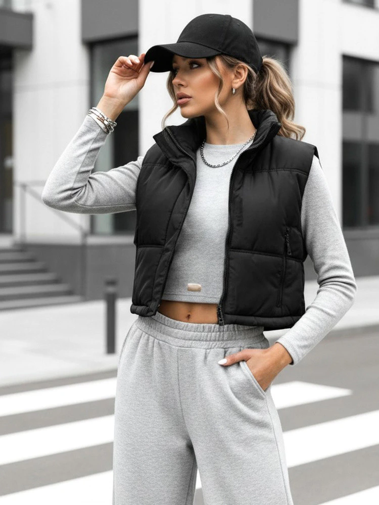 Krátká prošívaná vesta s vysokým límcem je univerzálním kouskem šatníku, který je ideální pro přechodné stylizace. Minimalistický střih poskytuje spoustu možností stylingu, zatímco praktické detaily přispívají k pohodlí.